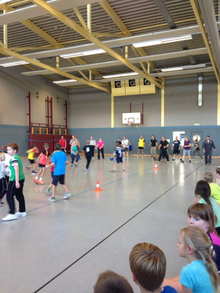 Der Sporttag begann mit 2 Kennenlernspielen, anhand derer man erkennen konnte, dass die Eltern der Klasse 5b nicht nur mit den eigenen Kindern gut zusammenspielen können.
