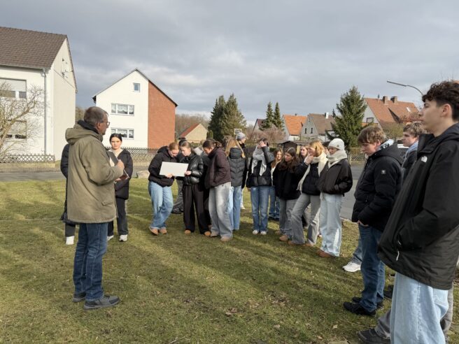 Zum Abschluss des Rundgangs wurden wir zu dem Ort gebracht, an dem sich zur Zeit des Zweiten Weltkriegs das KZ Niederhagen befand. Heute stehen dort bereits neue Häuser. Nur ein Denkmal erinnert noch an den Appellplatz des ehemaligen Konzentrationslagers.